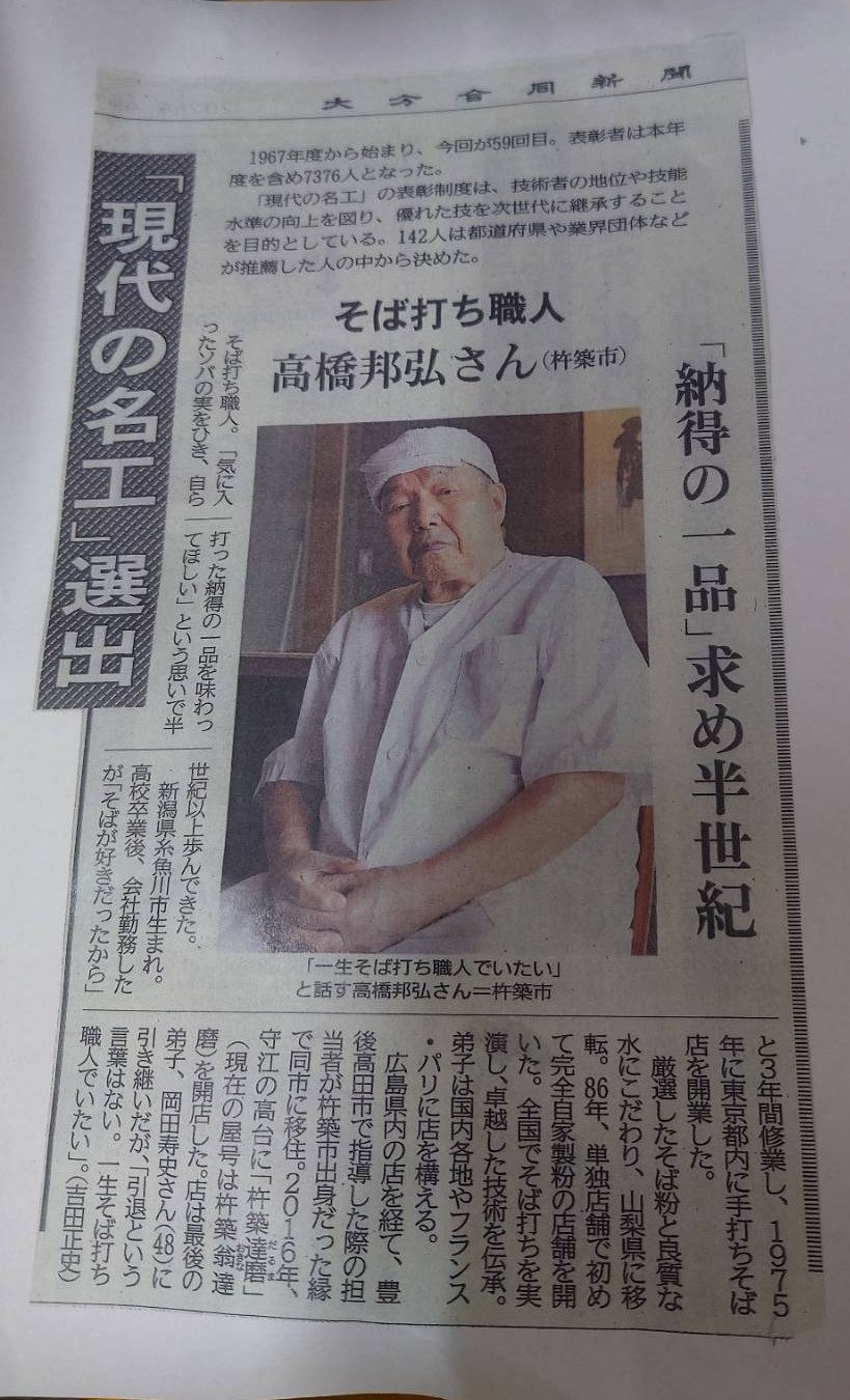 「引退という言葉は無い。一生そば打ち職人でいたい」「そば文化を広げ、残す役割を果たしたい」とインタビューに。師匠、これからも見守ってください。
